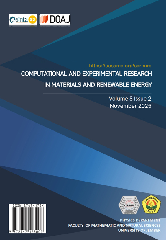 Vol. 8 No. 2 (2025)MATERIALS AND RENEWABLE ENERGY (CERiMRE) is an official journal of the Physics Department, Faculty of Mathematics and Natural Sciences, The University of Jember, Indonesia, in collaboration with KERIS (Research Group) KMTE (Komputasi Material Terapan dan Energi), The Physics Department, Faculty of Mathematics and Natural Sciences, The University of Jember, Indonesia. The CERiMRE publishes original research papers and reviews in the field of materials and renewable energy either computational or experimental works. The aim of the CERiMRE is to develop the intense communication among researchers in over the world in that fields. The CERiMRE publishes the articles twice a year in May and November.